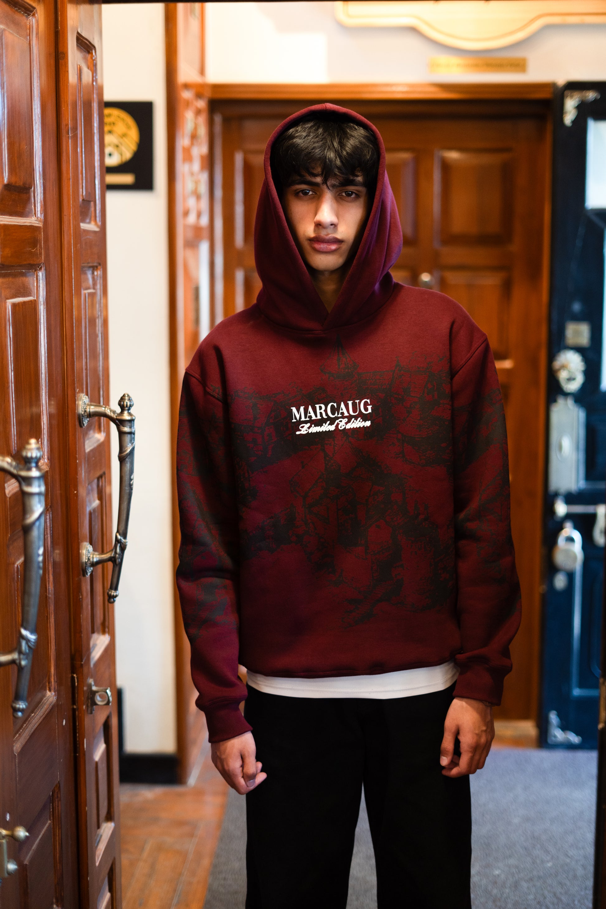 Step into timeless streetwear style with the Marcaug Limited Edition Hoodie in rich maroon. Crafted from premium heavyweight cotton, this hoodie combines comfort and bold design for an effortlessly cool look. The front features an intricate castle print graphic, giving it a distinctive artistic edge, while the “Marcaug Limited Edition” text adds a touch of exclusivity.