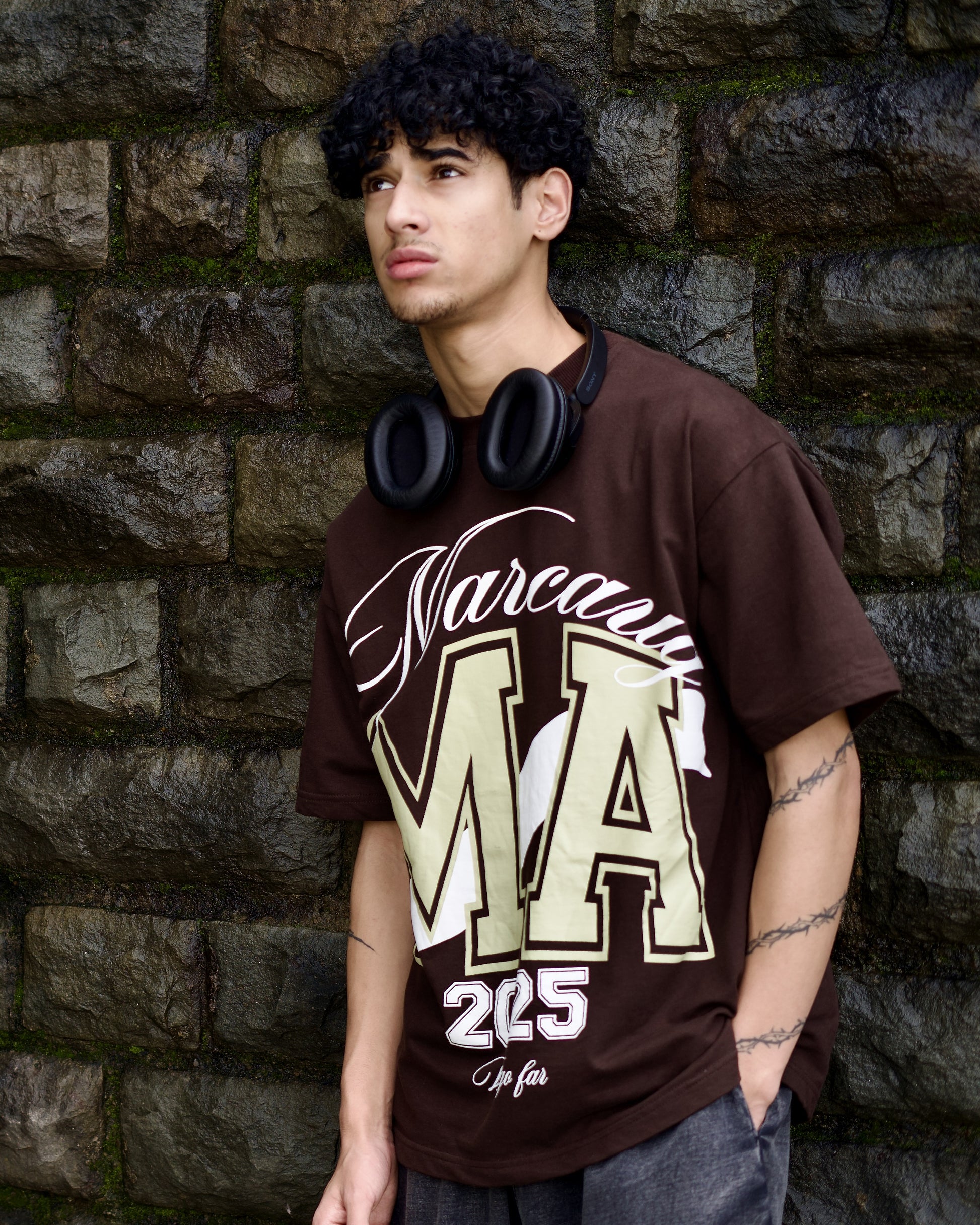 Channel classic collegiate energy with the “Varsity Spirit” tee. Designed from premium 240 GSM heavyweight cotton, this piece boasts an oversized varsity-style “MA 2025” print, complemented by a sleek script logo. The rich screen printing and sharp contrast create a luxurious and commanding streetwear essential — made for those who dare to go far.